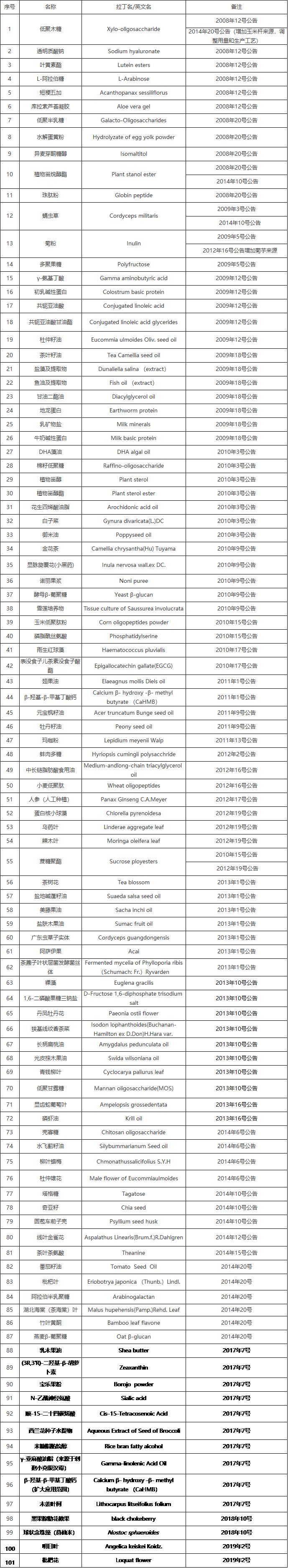 2008年以来原卫生部和国家卫生计生委公告批准的新食品原料(新资源食品)名单(截止2019年5月31日)